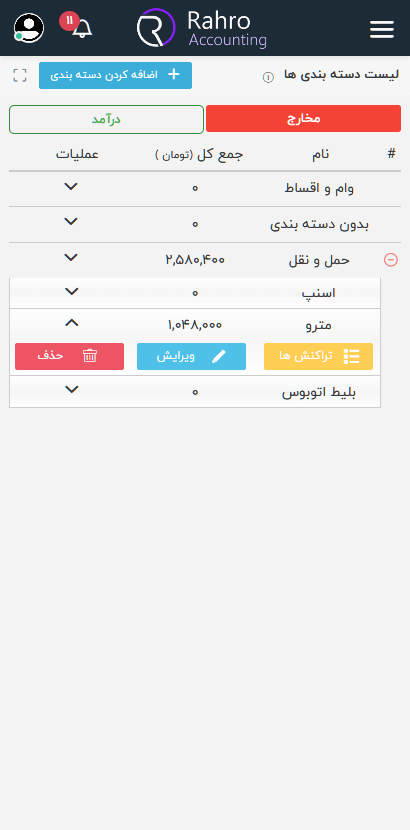 ما برای مخارج و درآمد هایتان دسته بندی هایی را در نظر گرفته ایم که میتوانید آن را شخصی سازی کنید و بر آن اساس از وضعیت مخارج و درآمدتون خبر داشته باشید.