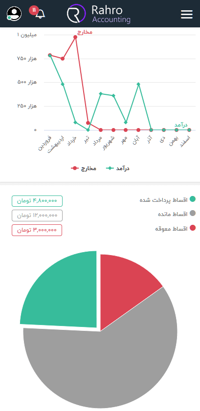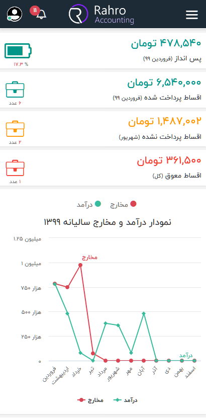 تمامی مخارج و درآمد 12 ماهه سال را بر روی نمودار می توانید مشاهده کنید.